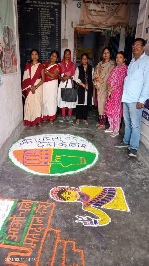 बाल विकास परियोजना कार्यालय  में   सोमवार को  मतदाता जागरूकता  अभियान  के साथ साथ पोषण पखवाड़ा भी मनाया  गया . सीडीपीओ शशि कुमारी से पुछने पर बताया  की कार्यालय के अलावे  कई गावो में स्थित आंगनबाड़ी केंद्रों  पर प्रारंभिक वाल्यावस्था देखरेख एवं शिक्षा विषय पर शपथ दिलाया गया. मतदान  करने के लिये लोगो को जागरूक किया गया.   पर्यवेक्षिका  कुमारी शारदा शक्ति , सरीता कुमारी के अलावे   सेविका सविता कुमारी,मंजू देवी सरिता कुमारी   ने रंगोली  बनाकर मतदान के महत्व को लोगो को बताया.    इस अभियान में कार्यालय कर्मी  मुकेश कुमार सहित अन्य  लोग  शामिल थे.