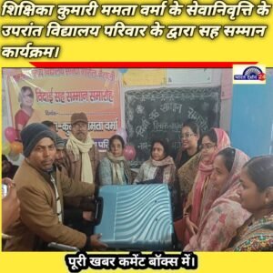 गोरौल। प्रखंड क्षेत्र के मध्य विद्यालय सोंधो में पदस्थापित शिक्षिका कुमारी ममता वर्मा के सेवानिवृत्ति के उपरांत विद्यालय परिवार के द्वारा श्रीमती वर्मा के लिए विदाई सह सम्मान कार्यक्रम का आयोजन किया गया।लगभग 20 वर्षों की सेवा से सेवानिवृत शिक्षिका कुमारी ममता वर्मा का कार्यकाल काफी सराहनीय और प्रेरक रहा है। कार्यक्रम की अध्यक्षता करते हुए विद्यालय के प्रभारी प्रधानाध्यापक राजेश कुमार ने कहा कि वह बच्चों के लिए शिक्षक और हम सभी शिक्षकों के लिए अभिभावक जैसी थी। कार्यक्रम में उच्चतर माध्यमिक विद्यालय सोंधो की संगीत शिक्षिका पायल कुमारी ने अपनी मधुर आवाज मे विदाई गीत गाकर उपस्थित लोगों को भाव विभोर कर दिया।कुमारी ममता वर्मा को शिक्षक राजीव कुमार,मनोज कुमार, शिवानंद कुमार सहित विद्यालय परिवार एवं उपस्थित प्रधानाध्यापको,शिक्षकों एवं ग्रामीणों के द्वारा अंगवस्त्र, पुष्पगुच्छ सहित अन्य उपहारों से सम्मानित किया गया। मौके पर विद्यालय की रसोइया ने खोईचा देकर सेवानिवृत शिक्षिका को विद्यालय से विदा किया। कार्यक्रम में प्रधानाध्यापक लालदेव पासवान,जितेंद्र कुमार, मीरा कुमारी पूर्व बीआरपी व प्रधान शिक्षक धर्मेंद्र कुमार ,शैलेंद्र कुमार, राकेश कुमार, जाकिर हुसैन, गीता सिंह, नीतू कुमारी, मनोज कुमार सहित अनेक शिक्षक उपस्थित थे । रिपोर्ट जाहिद वारसी